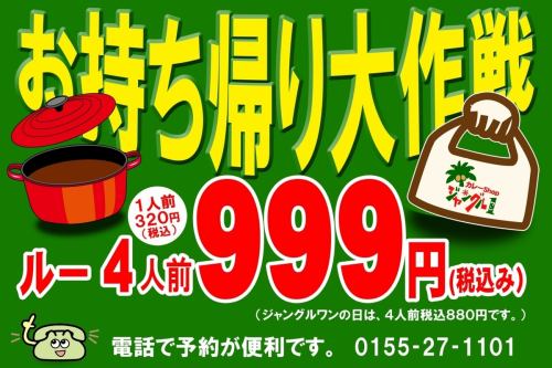毎週火曜日はお得!!店内でのお食事は、大盛りサービス!お持ち帰りルーは、2人前ご注文で1人前サービス致します。(合計3人前の量)【辛さ】甘口<ふつう<中辛<辛口<大辛【ライスの量】ハーフ60円引き<普通盛り<大盛り100円<特盛り200円<メガ盛り300円